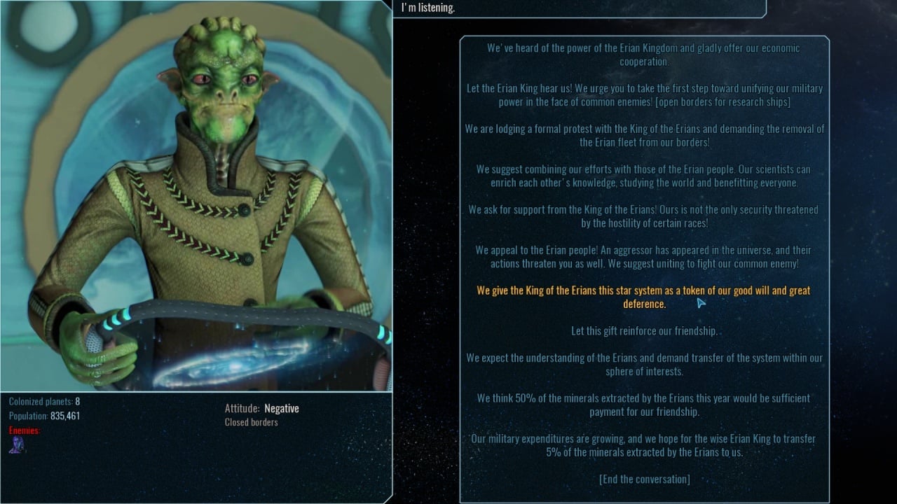 Основной сложностью является постоянная напряжённость между фракциями, переживающими за свою территориальную целостность. Лидеры других сторон постоянно находятся в состоянии боевой готовности. Для того, чтобы добить ценного союзника в этом враждебном мире придётся действительно постараться и найти общие цели, в которых лучше развиваться совместно. Проект обладает высоким уровнем кастомизации. Пользователю доступно меню настройки вселенной, в которое геймер попадает перед стартом нового сохранения. В нём выбирается размер карты, количество инопланетных рас, агрессивность фракций, количество бандитов, ресурсов и множество других параметров. Это влияет на баланс и создаёт совершенно другой игровой опыт.