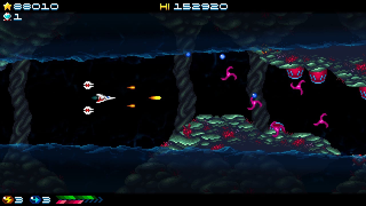 С каждым последующем уровнем вводятся новые типы врагов или условия действий. Получайте доступ к новым пушкам, прокачивайте возможности корабля и собирайте бонусы на локациях. Игра содержит множество секретов и несколько концовок, зависящих от стиля игры. Специально для проекта написано более 60 оригинальных композиций. Все аспекты шутера созданы полностью вручную.