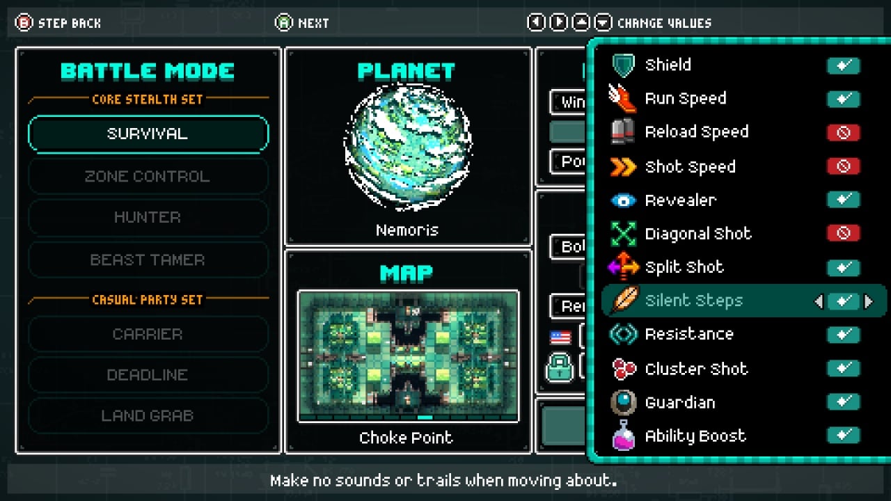 Старайтесь не затеряться в пространстве, поскольку ваш персонаж также скрыт. Ориентируйтесь по подсказкам, которые оставляет игра или по звукам. Разные поверхности издают разный шум, кусты шевелятся, снег оставляет следы и т.д. Игра длится до одного выстрела, поэтому каждая ошибка может стоить жизни. Каждый герой обладает своими способностями и навыками. Разработайте личную стратегию, стараясь играть в обороне или же активно идите в атаку. Игровой процесс Invisigun Reloaded опирается на вашу изобретательность. Предугадывайте действия других игроков и старайтесь подловить соперников на их ошибках. Особенности геймплея: