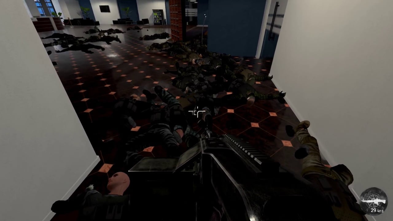 Процесс основан на проектах старой школы FPS, здесь много крови, противников, стрельба и ничего лишнего. Преувеличенное и жестокое насилие, разлетающиеся конечности от взрывов и многое другое, с чем столкнется игрок. Все же, здесь предстоит быть аккуратным и не спешить во время выполнения заданий. Перемещаясь по офисным зданиям, они будут напоминать лабиринты с большим количеством комнат. Проект включает 4 уровня сложности для новичков и продвинутых пользователей в шутерах от первого лица.