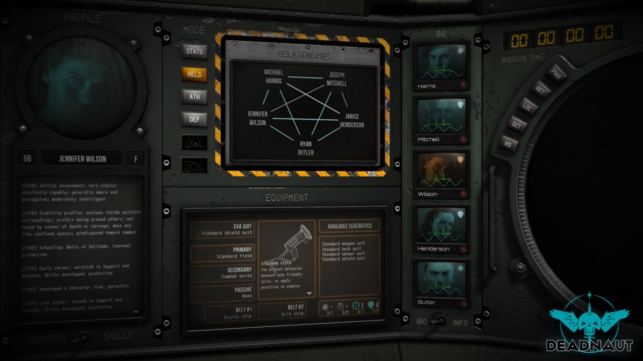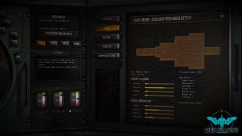 Интерфейс оформлен под контрольную кабину, где перед панелями, экранами и переключателями ломает голову командир разведчиков, отправленных в очередное реликтовое космическое корыто с тесными коридорами, грозящими развалиться от неосторожного чиха. Участников операции можно подобрать, исходя из их личностных характеристик, представленных в глубоко проработанных файлах досье. Люди Deadnaut профессиональные космонавты, каждый подкован в своей специальности, но межличностные антипатии внутри коллектива могут портить микроклимат отношений в команде. Координатору положено следить, чтобы между не нравящимися друг другу персонажами не возникало ссор. Конфликты снижают общую продуктивность действий, понижая рабочие навыки и увеличивая риск катастрофы. Для предотвращения оных допускается расформирование членов команды на группы, что тоже чревато опасными последствиями, так как людям может не хватить ресурсов, чтобы отбиться от внезапной атаки.
