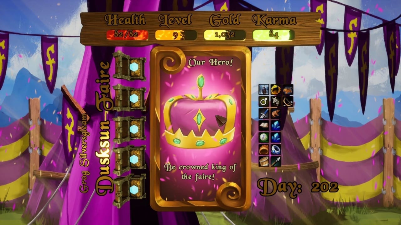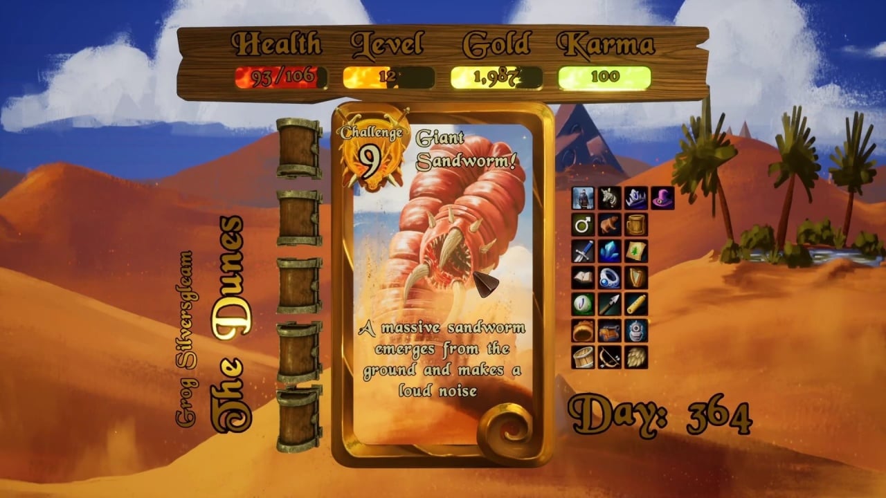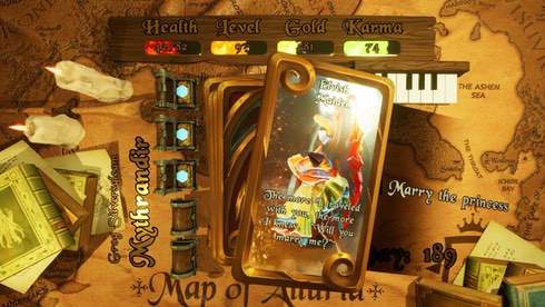 У протагониста есть 4 параметра: здоровье, уровень, золото и карма. Персонаж изучает мир, зарабатывает деньги и находит артефакты. Наличие или отсутствует тех или иных предметов по-разному влияет на события. К примеру, можно просто встретить крыс, и тогда будет доступно все два способа взаимодействия с ними: принять бой или убежать. Но, если посетить особого торговца, купить у него лютню, наткнуться во время путешествия на школу, согласиться на занятия и овладеть музыкальным инструментом, то при встрече с грызунами появиться опция с исполнением мелодий. Если сыграть этим созданиям, то они последуют за героем. А когда тот столкнется с крысиной королевой, та увидит его стаю и предложит жениться на ней. И таких цепочек в этом продукте очень много. Однако рано или поздно воин погибнет и потеряет прогресс. И тогда придется начинать всё заново. При новом забеге порядок ивентов поменяется.