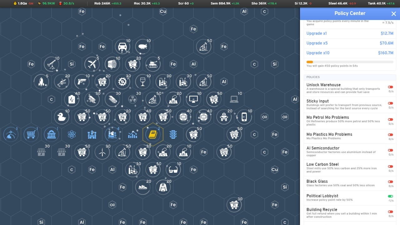 В свободном режиме всё начинается с нуля и заканчивается только по желанию пользователю. В кампании представлено 60+ уровней, где требуется достичь конкретной цели. В прохождении требуется взаимодействовать, добывать и продавать 50+ разных ресурсов. Многие элементы получаются только после длительной переработки. Карты генерируются процедурным образом, а на ней появляются шестигранные и квадратные сетки. Открытие доступа к политике поможет существенно изменить геймплей.