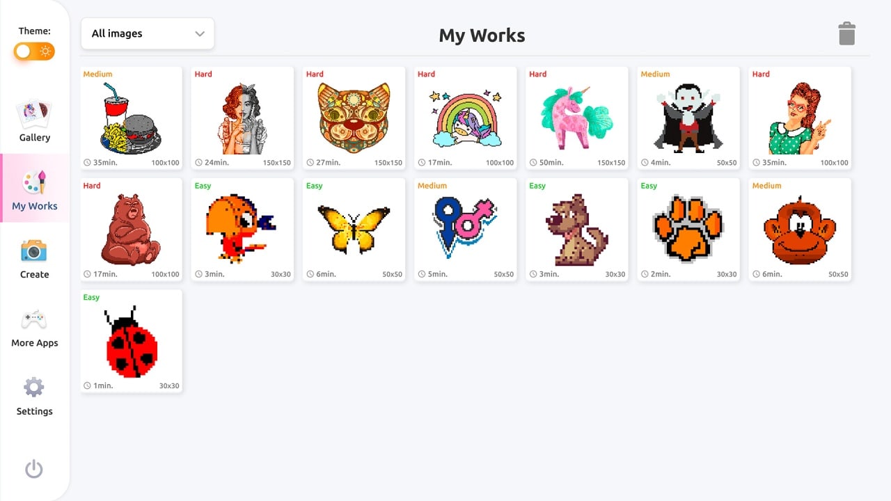 Перед геймплеем потребуется выбрать интересующие тематики: еда, архитектура и животные, а после превращать собственные изображения в пиксельный арт. Юзеры воспользуются обширными инструментами, как волшебной палочку для одного цвета, заливкой областей и прочих предметов. Присутствует возможность отдалять и приближать изображения, а также заниматься искусством в оффлайн-моде.