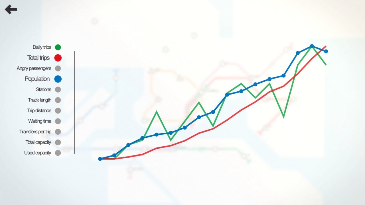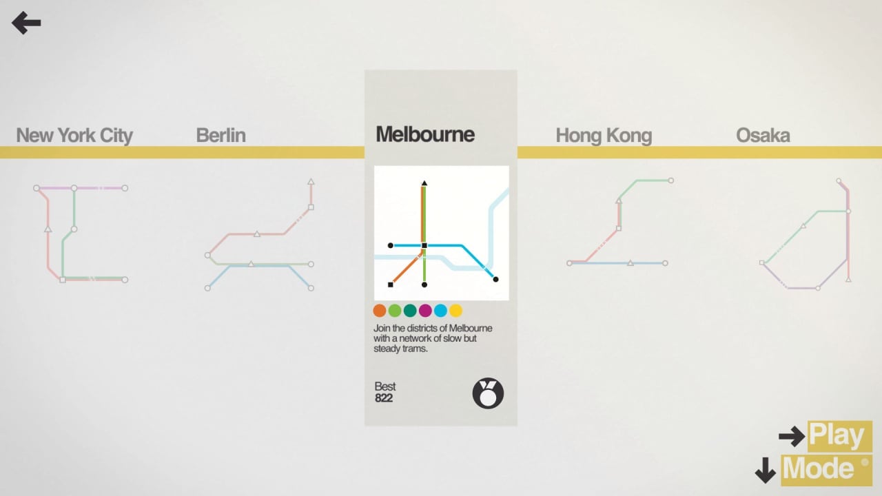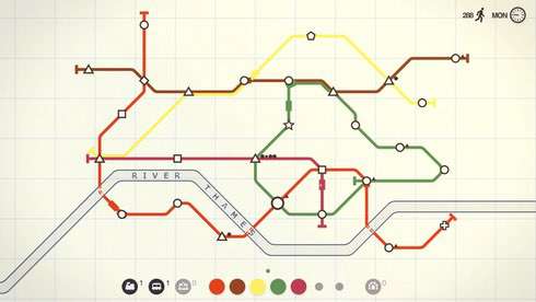 Создавайте и развивайте собственную сеть метро в Mini Metro. Город растет, как и количество людей, поток которых перегружает станции. Геймер создает ветки метро между подстанциями, рисуя горизонтальные, вертикальные, диагональные линии, где начинают ездить транспортные средства. Ветки дорог пересекаются исключительно в узлах станций либо под прямым углом. Платформы в игре изображены в качестве пустых квадратов, треугольников, звезд, способных вместить конкретных клиентов. Люди представлены также в виде фигур, которые соответствуют подстанциям.