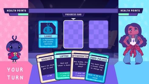 Tracks of Thought отлично подойдет для социально тревожных людей, так как игра предлагает развязывать обычные конфликты между людьми в виде карточной игры. Какую фразу вбросить, пойти ли по пути логики или оскорблений и как на это отреагирует собеседник? В ходе игрового процесса пользователь начнет лучше понимать людей в обществе и легче реагировать на простые жизненные ситуации.