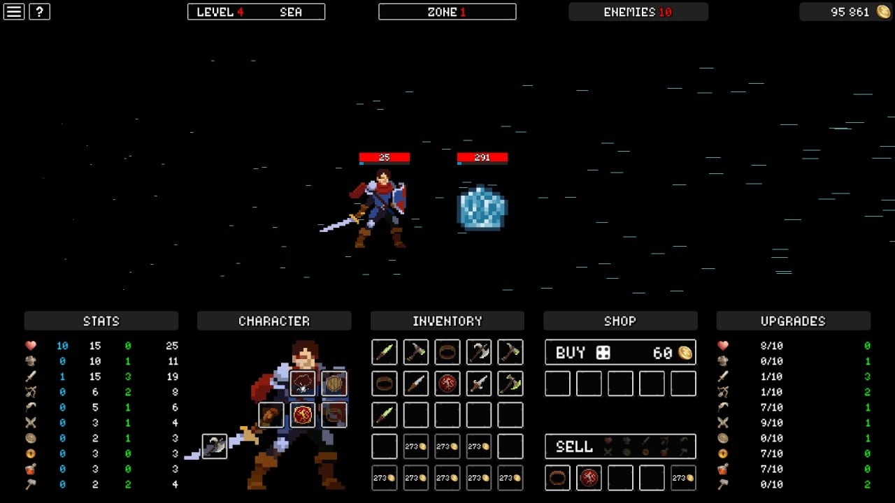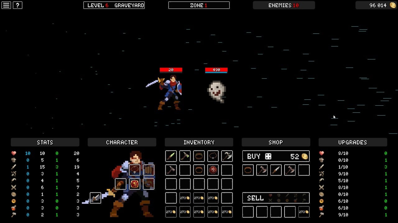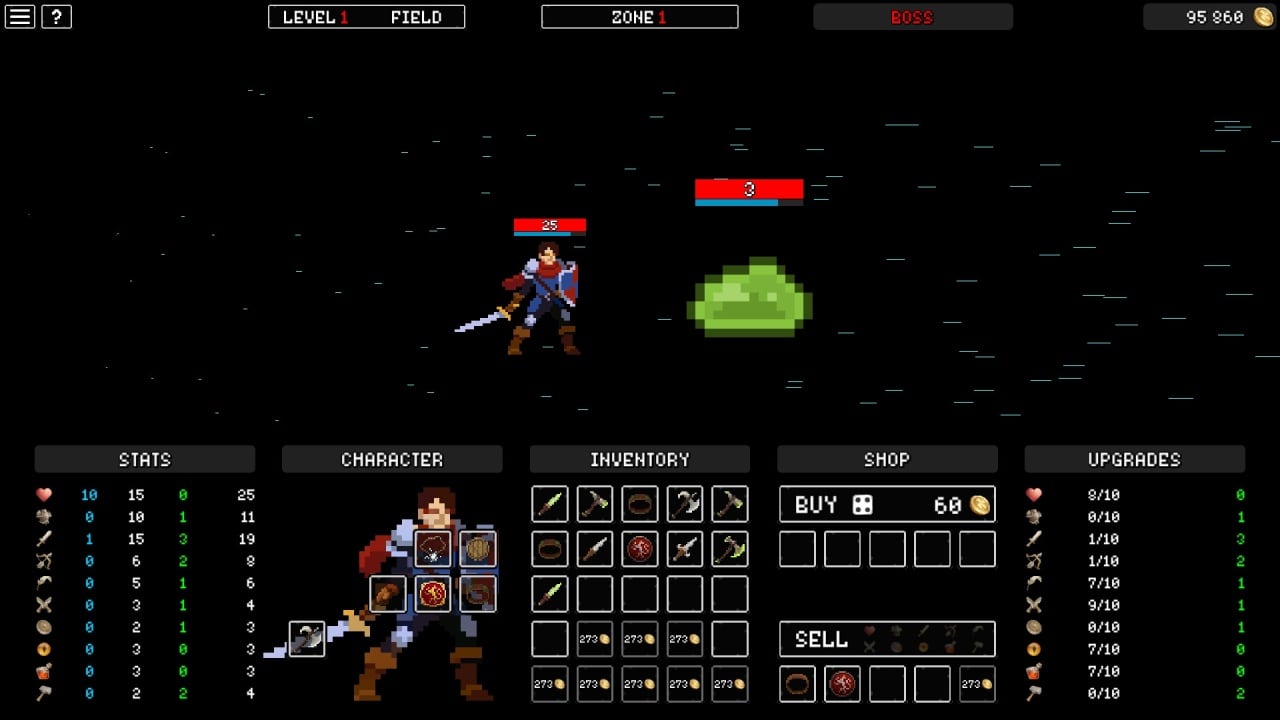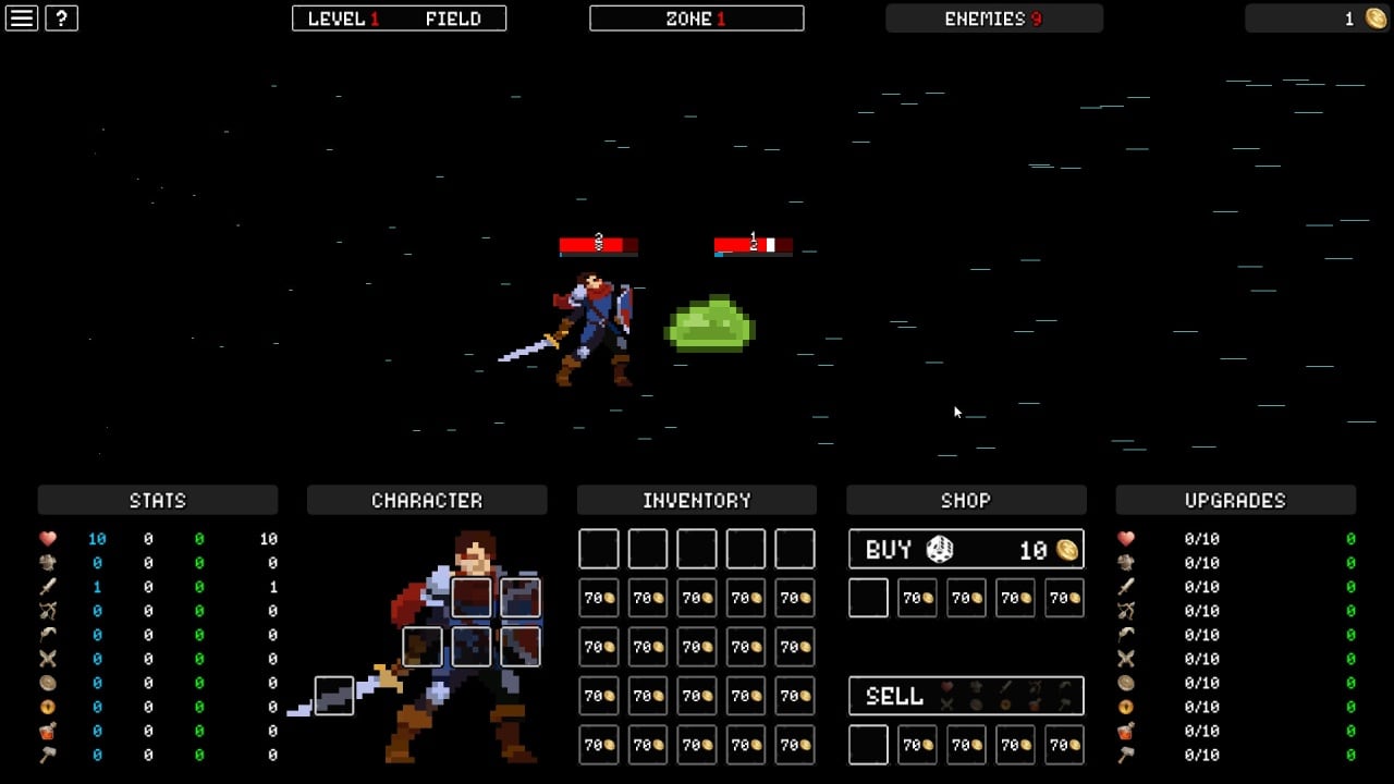 Окружение и персонажи выполнены в стиле пиксельной графики, а ретро-музыка на фоне делает приключение увлекательным. Доступно 2 темы оформления интерфейса: дневная и ночная. Во время боев можно сделать паузу, чтобы переключиться на вкладку инвентаря и переключить оружие, сменить доспехи или использовать зелье, после чего вновь вернуться в сражение. Рейтинговая система лидеров позволит отследить место среди пользователей по всему миру.