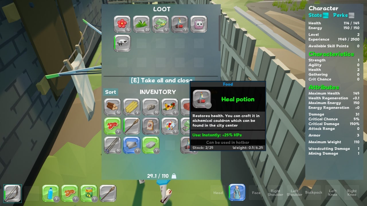 На старте пользователь начинает в роли самого обычного бомжа, у которого минимальные характеристики, практически отсутствует снаряжение и нет никакого оружия. Получая очки опыта, геймер способен прокачивать статус протагониста и повышать его параметры, необходимые для выживания. Также с убитых врагов или при исследовании локаций игрок находит деньги и снаряжение. Последнее можно использовать для экипировки героя. Помимо оружия, одежды важно собирать еду, воду, медикаменты и другие расходники, без которых невозможна жизнь.
