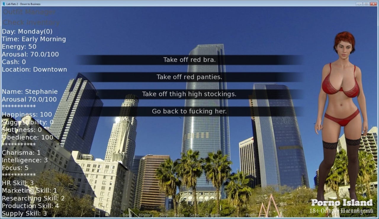 Все девушки Lab Rats имеют свой индивидуальный характер, предысторию и, главное, личные предпочтения в сексе, поэтому контент найдется даже для самых искушенных любителей клубнички. Примечательно, что сотрудницы лаборатории генерируются случайным образом, поэтому игроков ожидает уникальные постельные сцены с каждым новым прохождением. Потребуется построить свою фармацевтическую империю, развращая сексуальных девиц. Добровольцы выстраиваются в очередь, чтобы попробовать новый препарат. Он вызывает огромное влечение и желание у женщин. Необходимо не упустить момент, чтобы воспользоваться моментом! Но не следует забывать про огромную ответственность, а это значит, что все принятые решения имеют свои последствия.