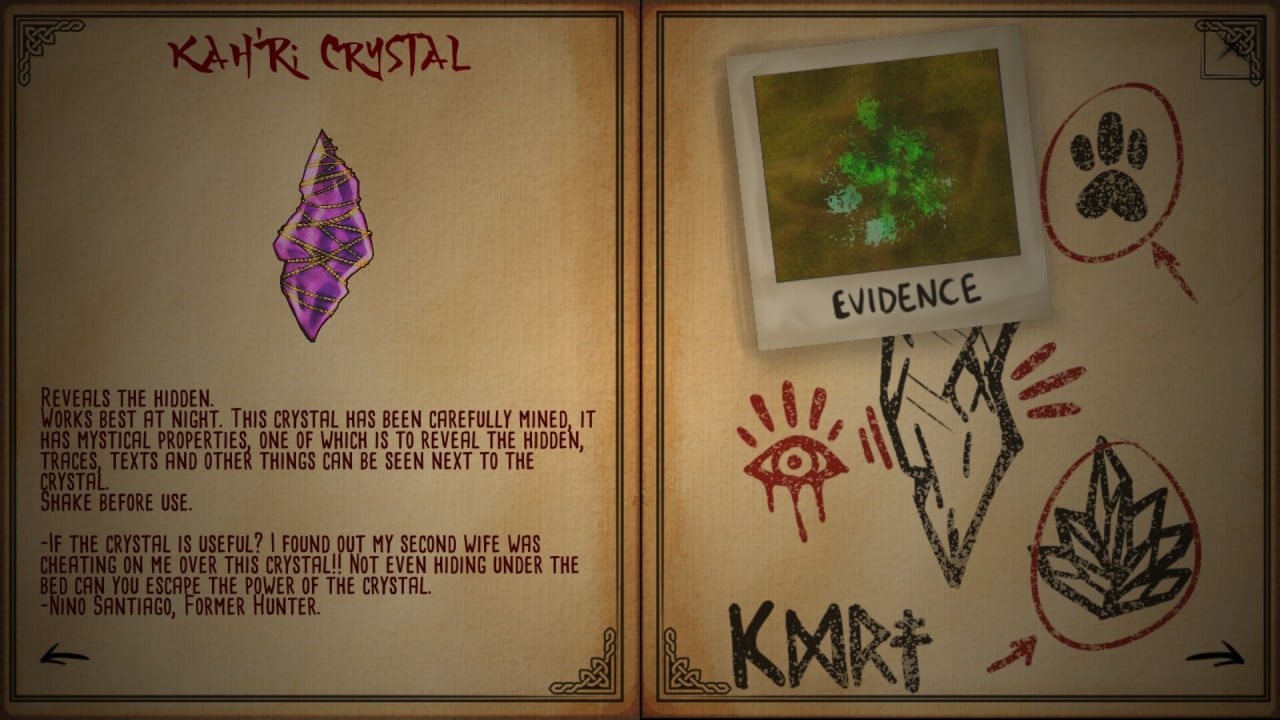 Магические кристаллы, фонари и компасы - вот лишь некоторые из инструментов, которые предоставляет гильдия, но будьте готовы заплатить высокую цену за их услуги. Чешуя, мех и другие улики могут стоить немалые деньги на рынке арканов, поэтому охотьтесь с умом. Чтобы выследить свою цель, вы должны обращать пристальное внимание на оставленные ею улики. Пушок меха, следы когтей, отпечатки ног и другие малозаметные признаки приведут вас к успеху. Внимательно наблюдая за деталями и отмечая каждую улику, вы сможете определить вид существа, на которое охотитесь. В игре Grimhunt важен каждый звук, след когтей и отпечаток лапы. Поэтому будьте бдительны, сосредоточенны и не теряйте бдительности. Вы готовы к испытанию? Пусть охота начнется.