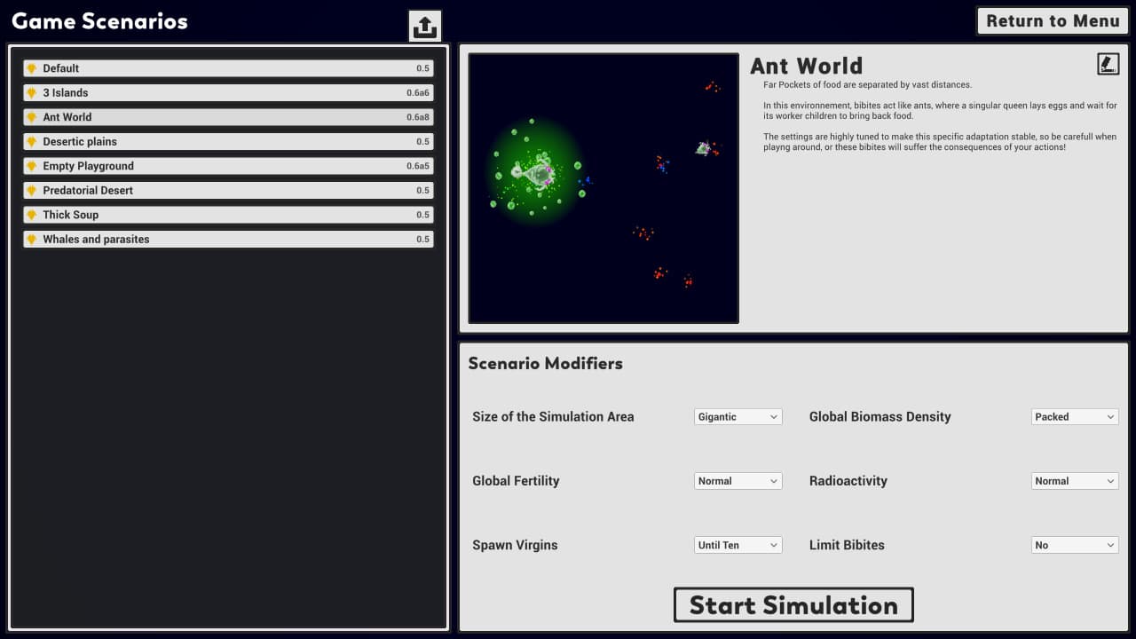 Настраивая температуру, рельеф или доступные ресурсы, геймеры могут создать условия, которые заставят бибитов адаптироваться к новым условиям. От пышных лесов до бесплодных пустынь - каждая среда представляет свои трудности. После создания сеттинга юзеры могут заселить эти миры бибитами, которые могут быть импортированы из файлов сохранения или созданы с нуля. Благодаря такому уровню контроля каждый пользователь получает свой опыт, и нет двух одинаковых игр.