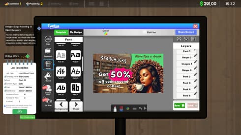 Ad Agency Simulator ставит вас на место профессионала в области рекламы. Начав с небольшого офиса и компьютера, юзеры должны построить агентство с нуля. Игра сосредоточена на процессе разработки рекламных кампаний, включая логотипы, плакаты, вывески и билборды, для клиентов в шумном городе. Все дело в творческом подходе, решении проблем и работе с клиентами. Каждый выполненный проект приносит вам деньги и повышает репутацию. По мере роста вашего агентства вам придется жонглировать множеством задач, балансируя между удовлетворением потребностей клиентов и увеличением объема работы.