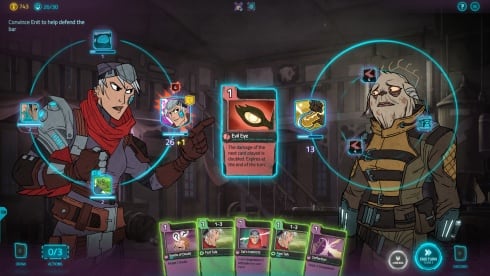 Бои пошаговые, каждый ход вы с оппонентом достаёте карточки в руку и в зависимости от доступного количества действий, разыгрываете их (они имеют разные стоимости). Они могут быть наносящими урон или блокирующими дамаг по вам. Вы будете предупреждены о ходе противника и у вас есть время подготовиться к его выпадам. Вам предоставлен выбор – убивать соперника или дать сбежать. Это влияет на дальнейшие события.