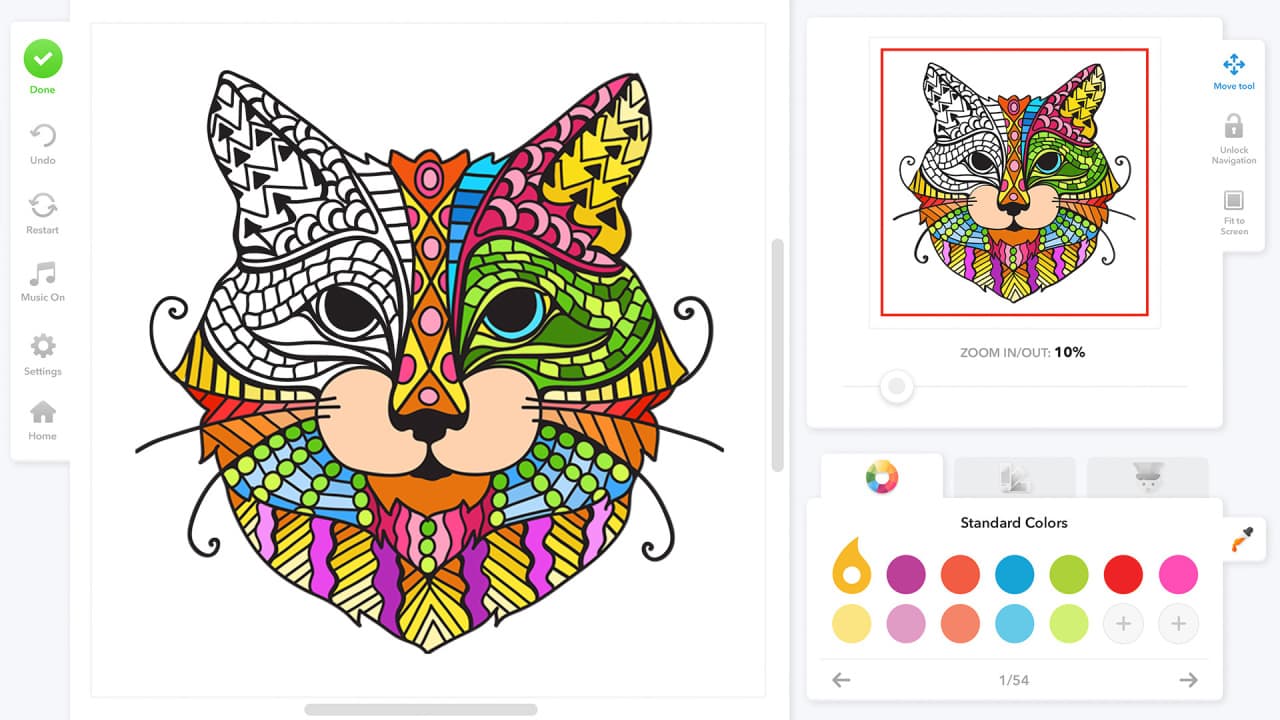 Геймер выбирает интересующий эскиз, после чего применяет предложенные цифровые инструменты для заполнения выделенных сегментов изображения выбранными пигментами, концентрируя внимание непосредственно на процессе подбора и распределения оттенков. Данный игровой процесс способствует активному взаимодействию с представленными визуальными компонентами и стимулирует эксперименты с различными цветовыми комбинациями. В рамках Coloring Book for Adults тайтл открывает юзерам свыше 20 тематических сборников эскизов для раскрашивания, при этом каждый отдельный сборник может включать до 30 уникальных листов.
