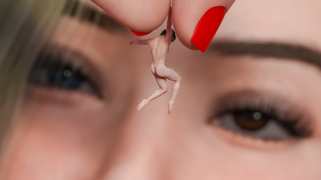 Between Her Toes начинается с того, что игровой персонаж претерпевает уменьшение физического роста, становясь частью своего первоначального роста. Ранее сосед по комнате, протагонист теперь является фигурой уменьшенных габаритов по отношению к женщине, Хлое, перемена, которая переопределяет их связь. Это изменение в пропорциях становится центральным в их последующих контактах, исследующих расстановку сил и акты подчинения.