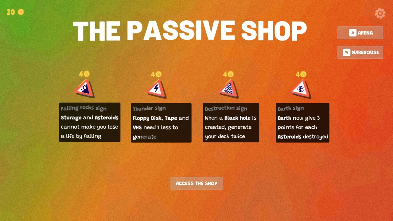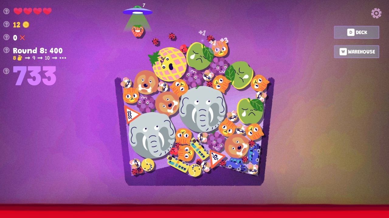 Другие категории, вроде букв, обладают собственным вращением, влияющим на их траекторию и укладку. Каждый из 70 доступных предметов влияет на игровой процесс уникально, в зависимости от его взаимодействия с физической системой или другими категориями вещей в контейнере. Чтобы разнообразить стандартный игровой цикл, можно использовать более 40 пассивных вещичек для создания комбинаций и исходов. Эти пассивки вводят модификации правил, заставляя каждый объект непрерывно вращаться или превращая каждую вещь в автомобиль. Прохождение выстроено через 7 разных арен, где каждая локация заканчивается столкновением с боссом.
