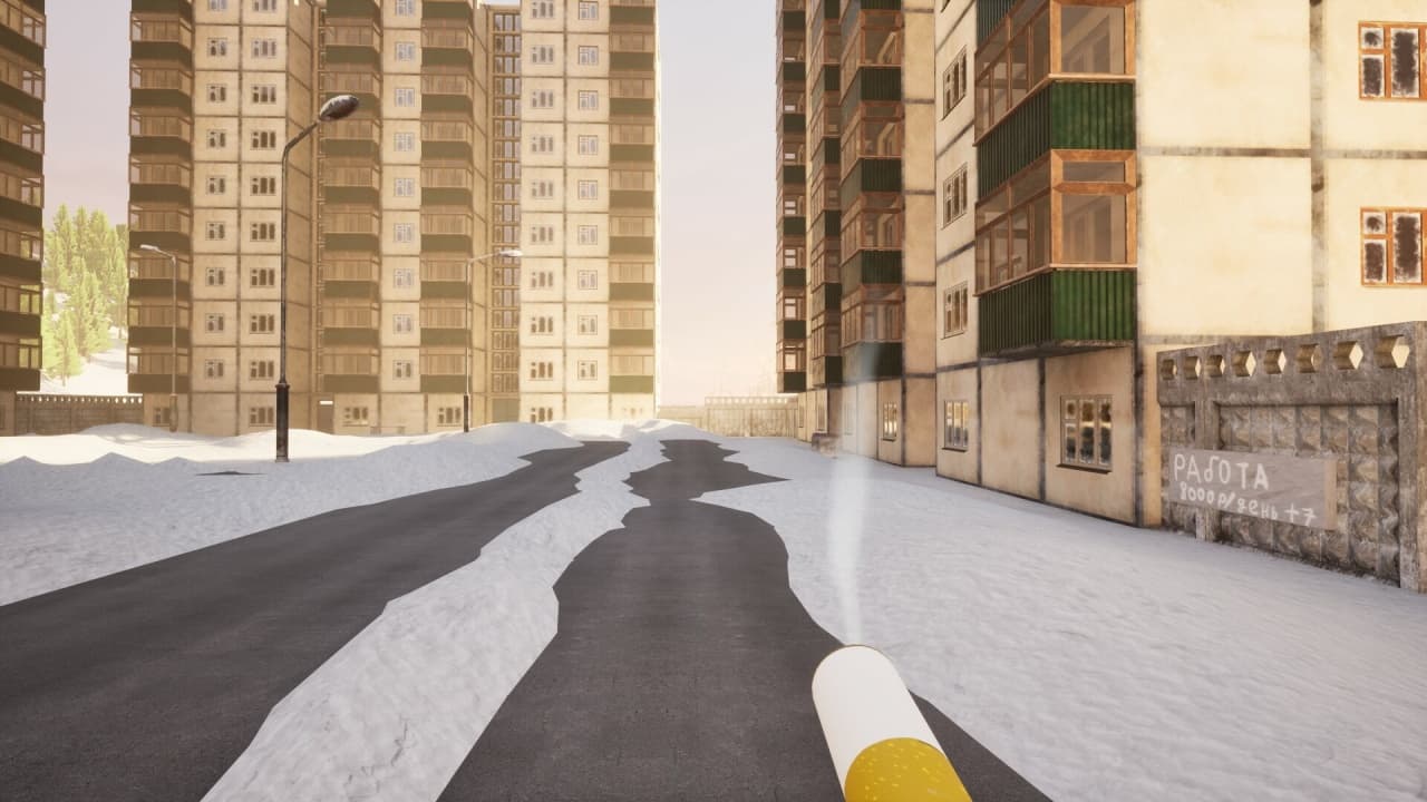 Smoking Simulator — медитативное путешествие в сюрреалистичный мир Cigaretteland, где единственная цель — расслабление и созерцание. Протагонист оказывается в заснеженной, атмосферной деревне, созданной для умиротворенного исследования. Здесь нет сложных заданий, противников или ограничений по времени. Основной процесс заключается в неспешных прогулках по живописным локациям, изучении причудливых деталей окружения и возможности в любой момент выкурить сигарету, наслаждаясь моментом покоя. Окружающий мир наполнен не только красивыми пейзажами, но и разнообразными произведениями искусства на стенах зданий, а также скрытыми юмористическими отсылками, которые можно обнаружить во время прогулок.