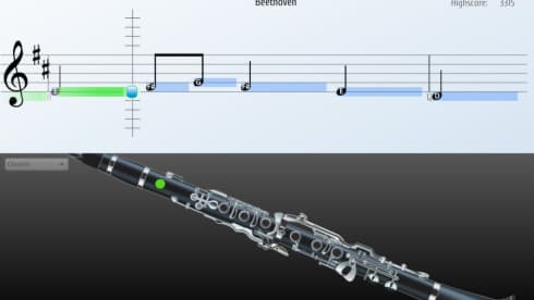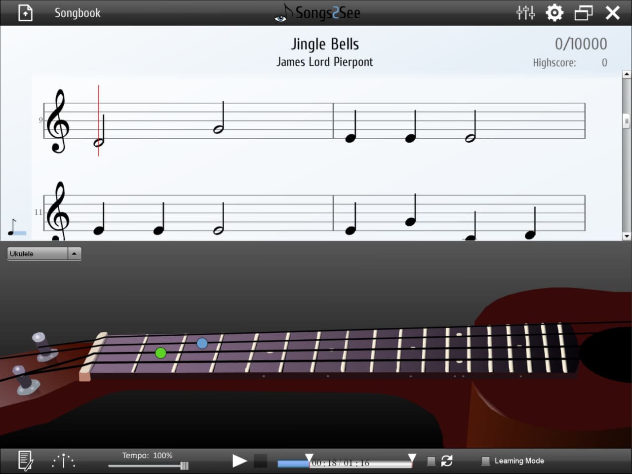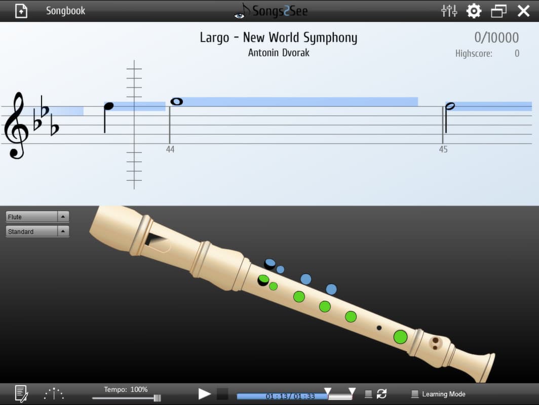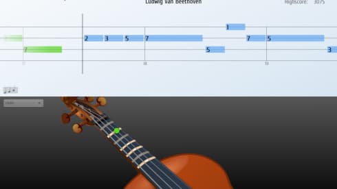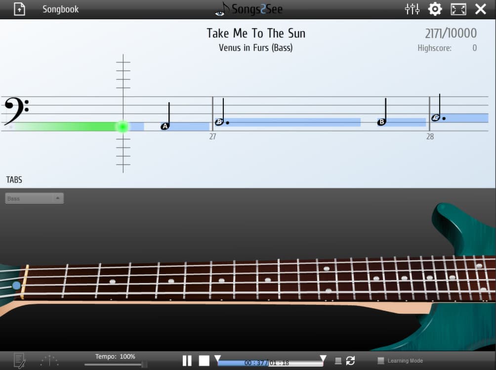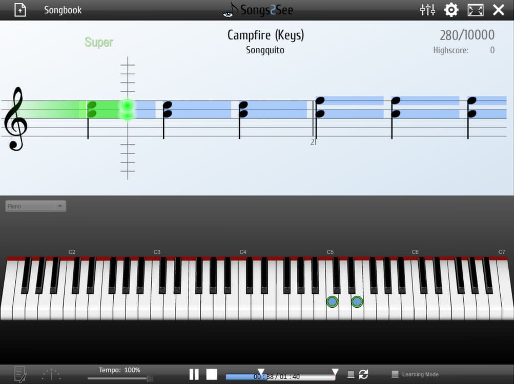 Процесс обучения построен на визуализации и геймификации. На экране отображается анимация движущейся партитуры, где длительность нот показана синими блоками, а высота — их положением на нотном стане. Для дополнительного удобства в Songs2See реализован режим, демонстрирующий правильную аппликатуру для выбранного инструмента в реальном времени. Зеленые метки показывают текущую позицию пальцев, а синие — следующую, что помогает заранее подготовиться к смене ноты. Предусмотрен также специальный режим обучения, позволяющий осваивать сложные музыкальные отрывки пошагово, повторяя их в замедленном темпе.
