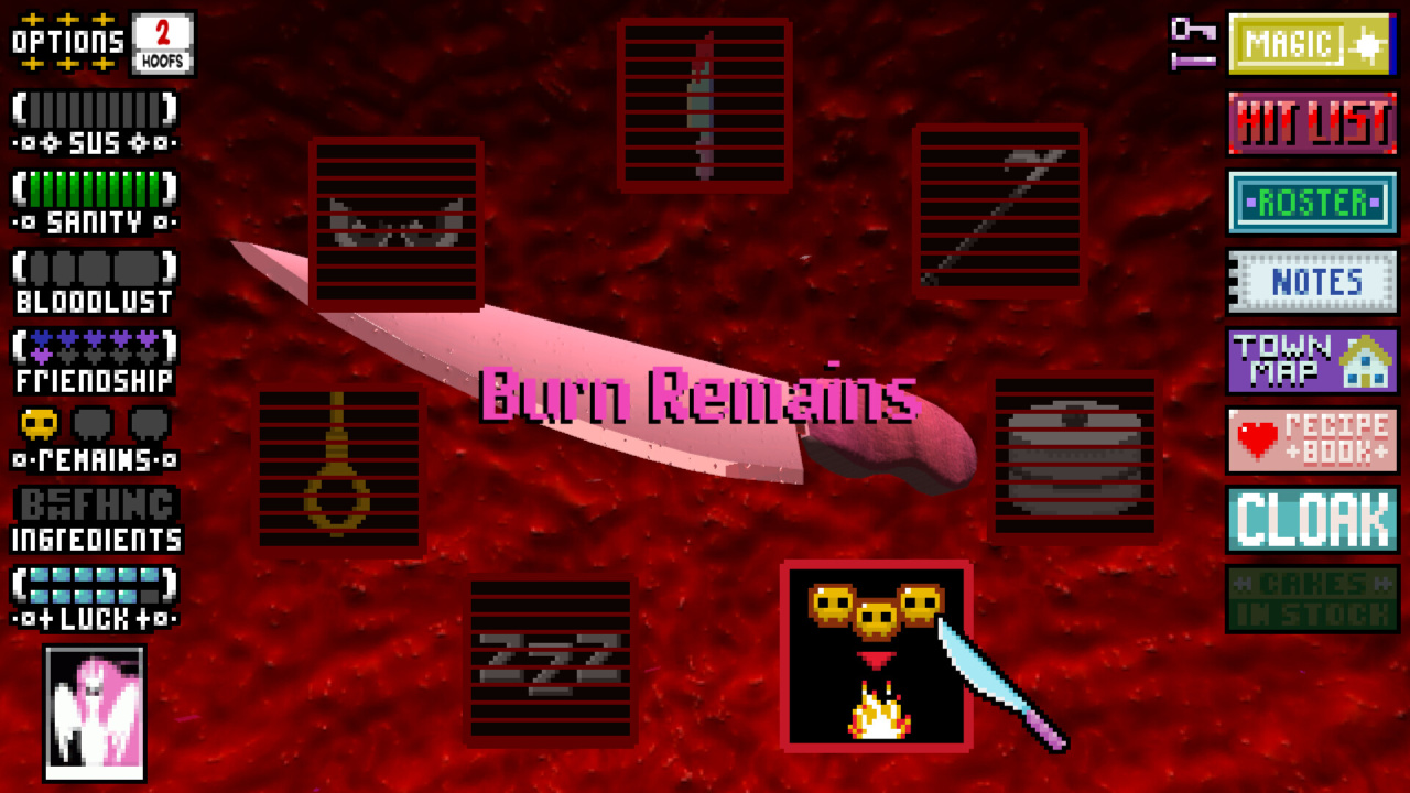 Slaughter Horse 2 — это мрачная ролевая стратегия, заставляющая геймера постоянно адаптироваться к растущей угрозе со стороны мирного населения. Днем протагонист ведет бизнес по производству дьявольских тортов, а ночью превращается в безжалостного ликвидатора. Верный питомец берет на себя выполнение рутинных поручений, пока тайный фанатичный последователь снабжает злодея сведениями о местах проживания жертв. Пойманные горожане отправляются в подвал, пытаясь обменять жизни на крупицы важной информации. Напряжение неумолимо возрастает: обитатели поселения становятся параноидально подозрительными, начиная поиски маньяка. Кампания строится на принципах социальной дедукции, заставляя манипулировать сознанием окружающих.