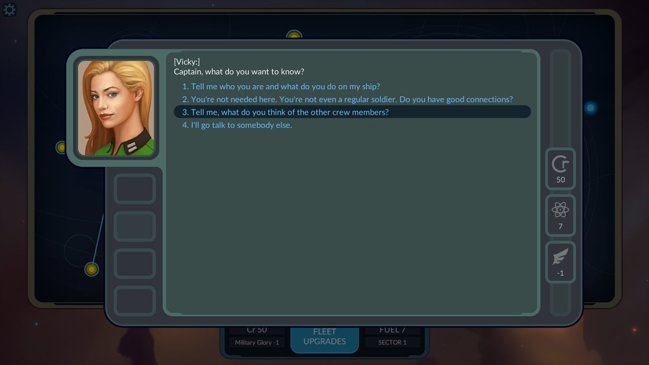 Беседуйте с персонажами – пришельцами, пиратами и торговцами. Выбирайте варианты ответов и действий.