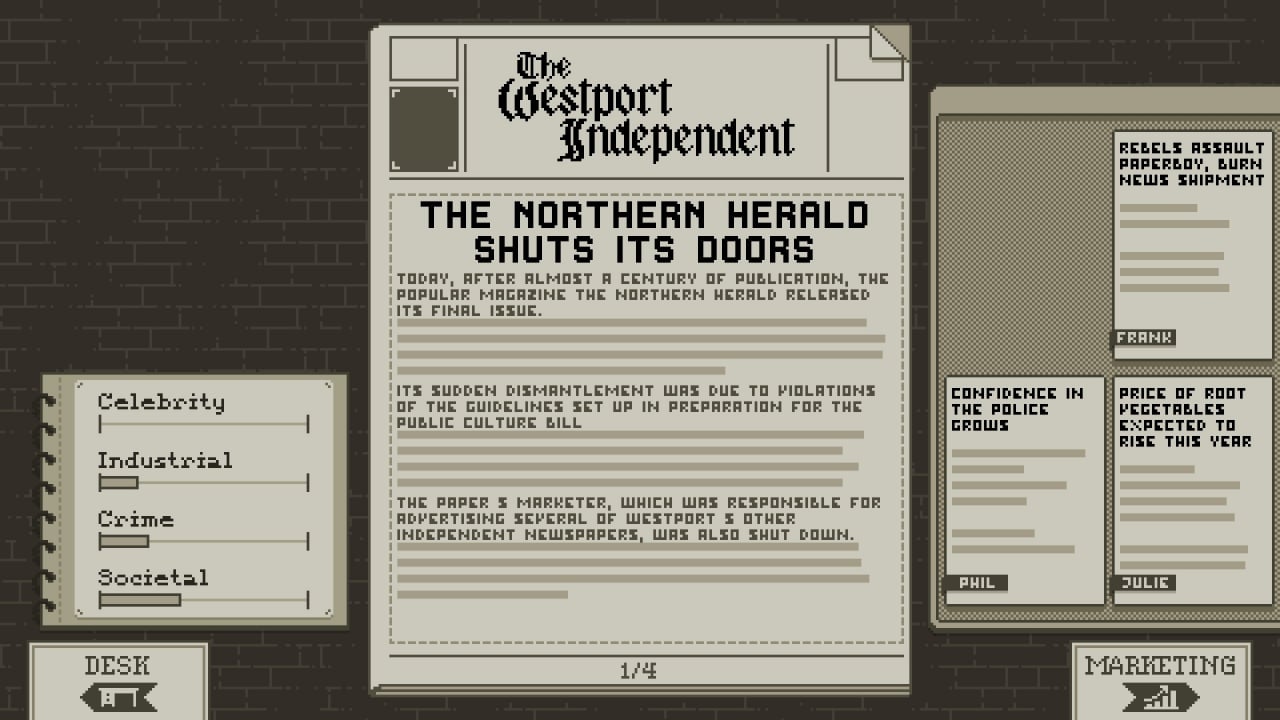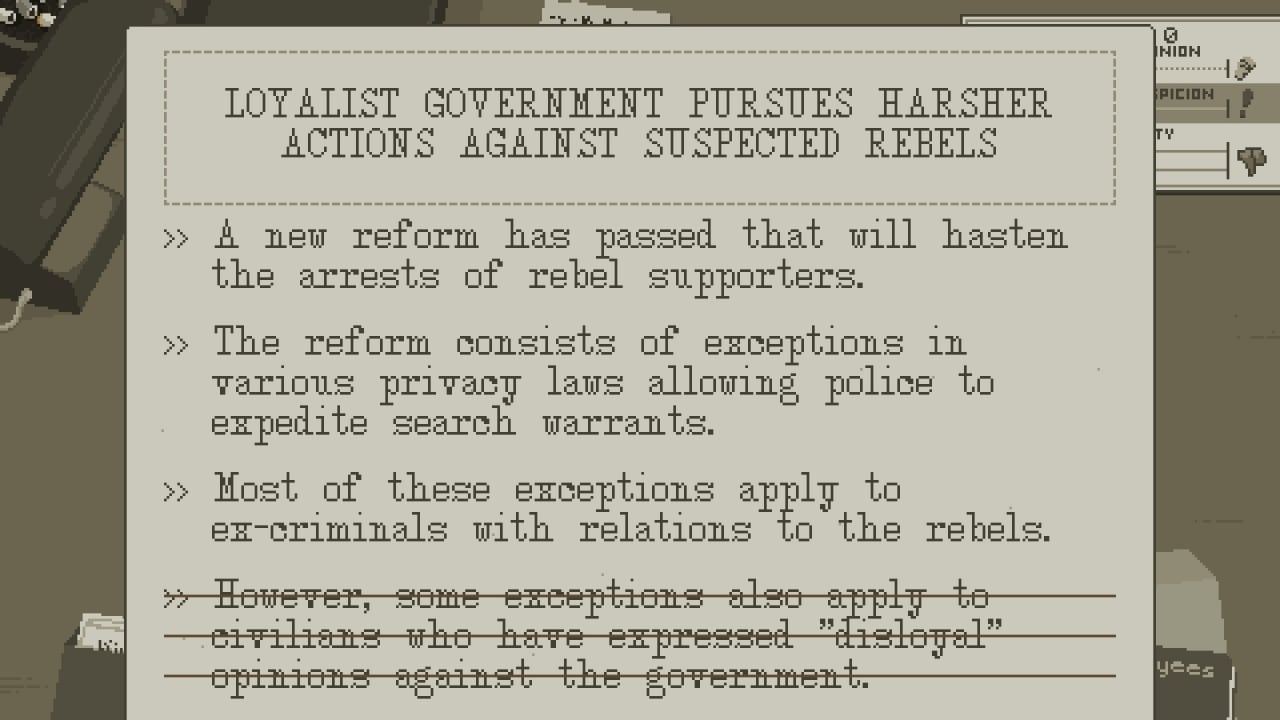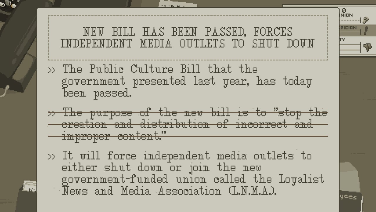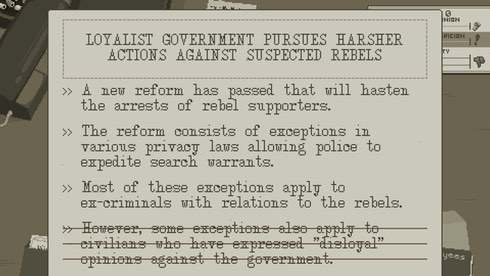 Пользователь редактирует и удаляет не корректную информацию, что определенным образом влияет на формирование мнения граждан о правительстве и оппозиции. В симуляторе редактора газеты на геймера давят со всех сторон - коллеги-журналисты, требующие публикаций своих текстов, повстанцы, желающие открыть всем глаза на происходящие события, и Лоялисты, пресекающие любые проявления мятежа. Здесь надо аккуратно угодить всем и не обидеть ничьи права, при этом, писать важно исключительно правду. В процессе игрок часто получает письма от недовольных общественных деятелей, коллег и лидеров повстанцев.