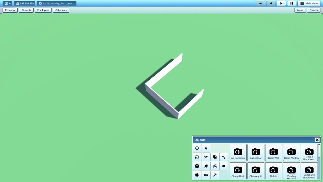 Особенностью игрового процесса будет гибкий и глубокий редактор помещений, позволяющих возвести фундамент и выстроить архитектуру университета с нуля для того, чтобы создать уникальное здание с самобытной структурой. Доступны к размещению: аудитории, конференц-залы, лекционные, актовые и спортивные залы, столовые, холлы, гардеробы, кафедры и кабинеты деканов и ректоров и так далее.