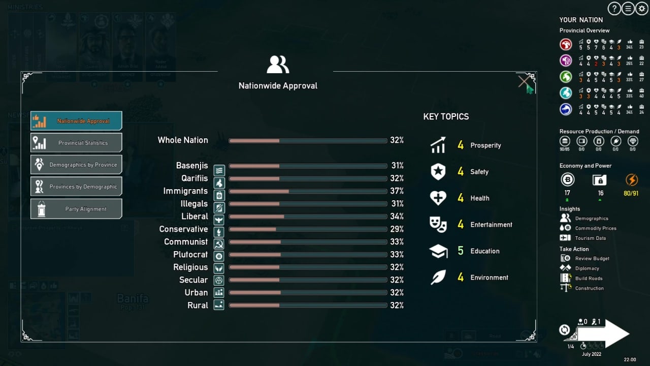 Помимо строительства и развития инфраструктуры, геймеру предстоит заниматься политической жизнью, нанимая людей, трудящихся на благо нации в Кабинете Министров. Основная проблема – игрок не осведомлён, кто из этих чиновников окажется предателем, тайно работающим против существующей власти ради интересов третьих лиц. Существуют несколько механик вычисления шпионов, с помощью которых можно удержаться в президентском кресле подольше.